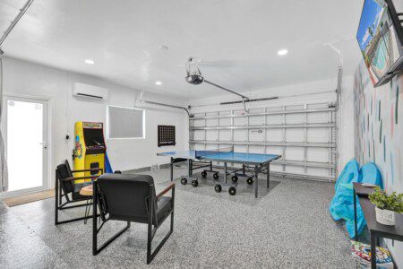 • Game room in the garage with a ping pong table, PAC MAN, and many board game classics