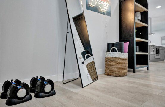 • Dedicated workout area with yoga mats, workout mats, adjustable weight dumbbells, and some elastic bands