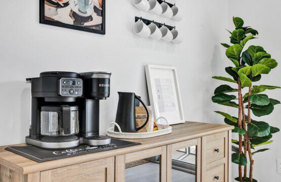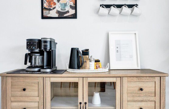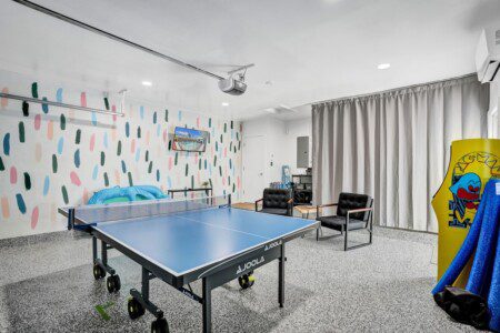 The living room invites you to unwind with a big screen TV, while the gaming room — set in a spacious garage — promises hours of fun with a ping pong table, Pac-Man machine, board games hung on the walls, lounge chairs, and another TV. You’ll also find a dedicated dual workspace with two monitors, perfect for remote work or catching up on emails, along with a small workout area equipped with mats and dumbbells for your morning routine. The fully stocked kitchen comes with everything you need to prepare delicious meals. At Papa’s Getaways, we pride ourselves on stocking kitchens so well, you could host your turkey dinner here. Dine together in the spacious dining area or step outside to the patio for a meal at the large outdoor dining table with a barbecue. All TVs are Roku and come with YouTube TV, offering all the basic channels and a great selection of sports networks.