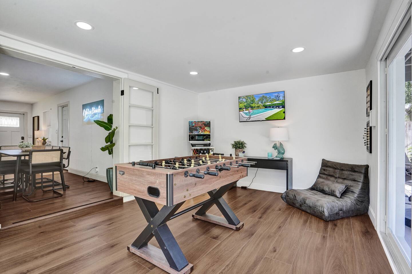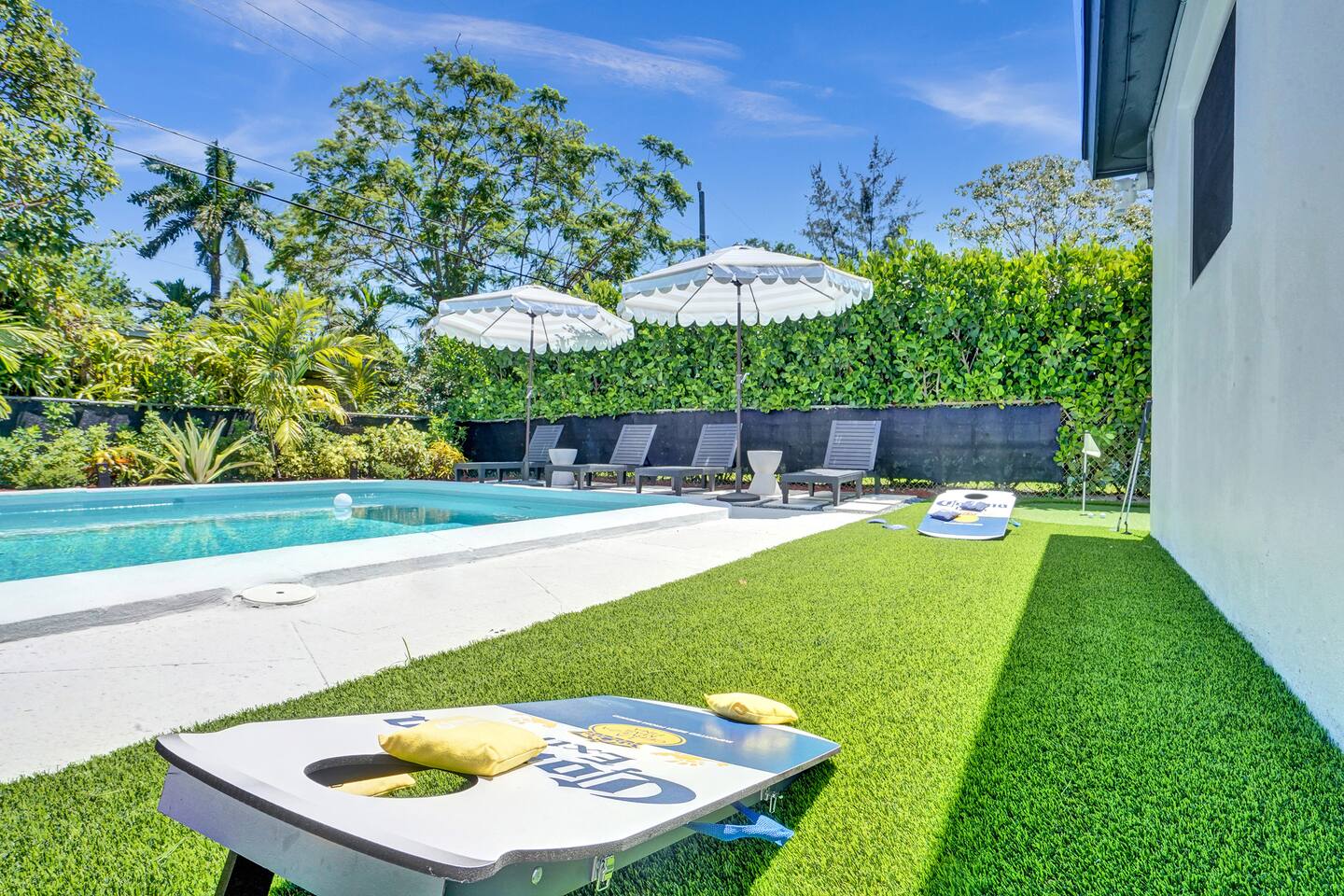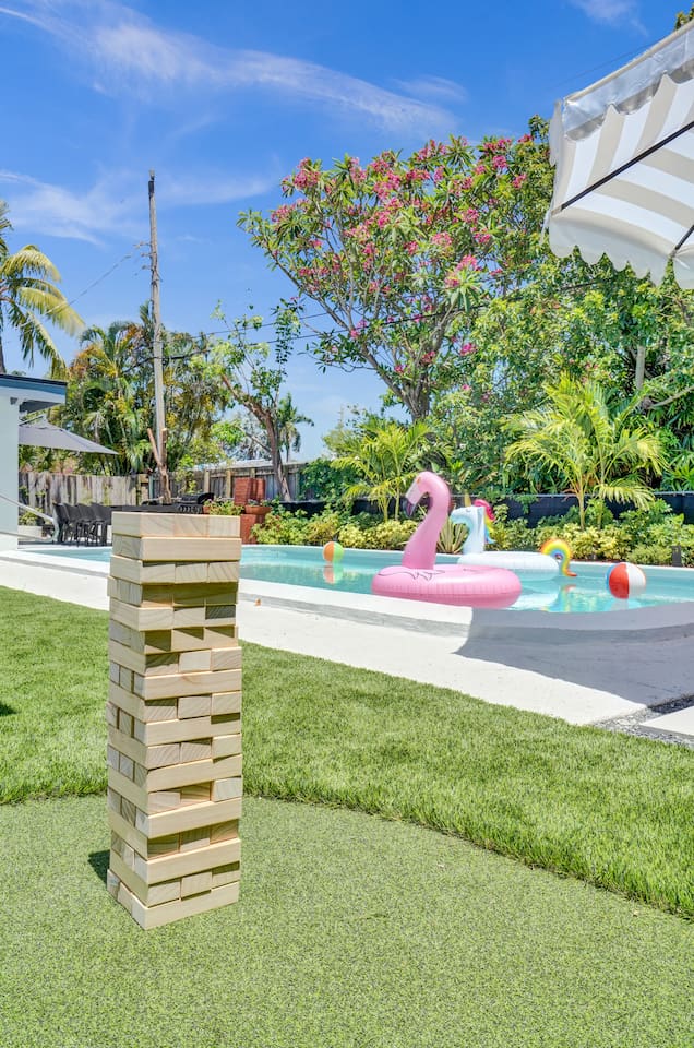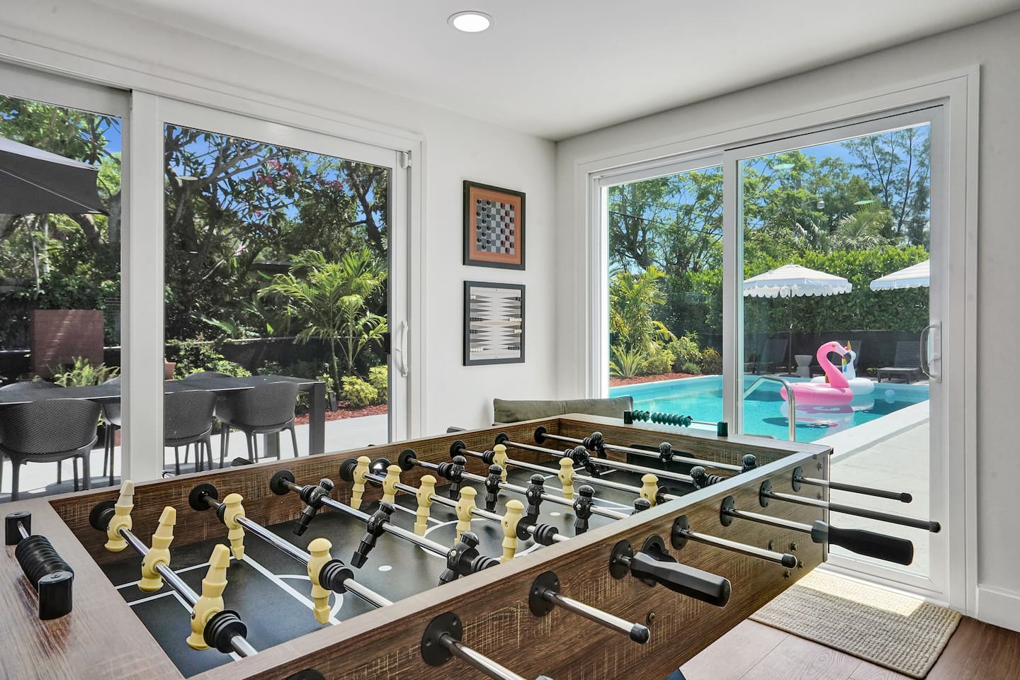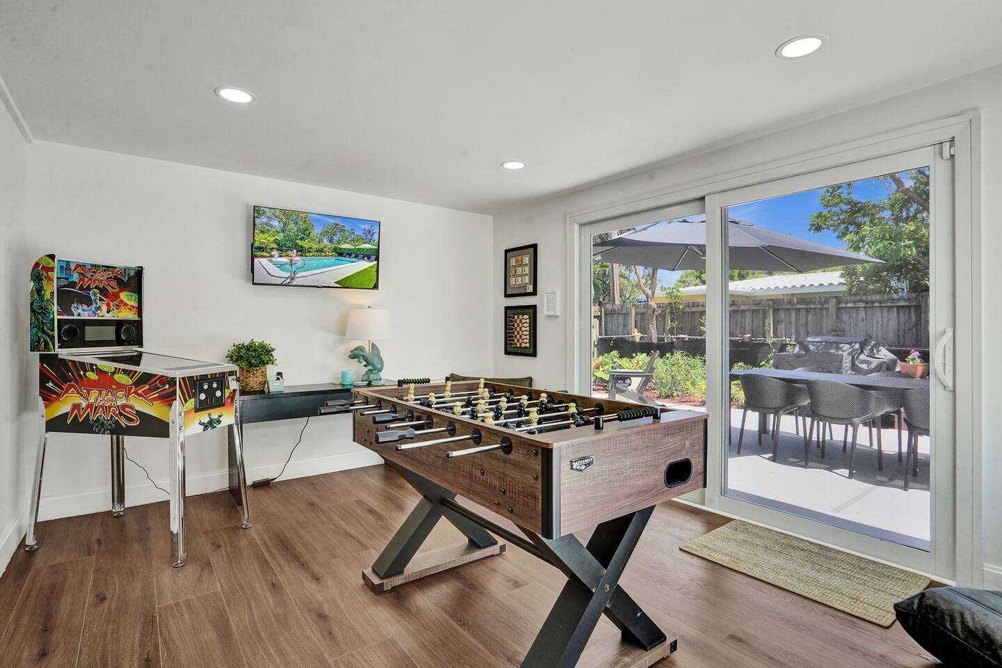Palmpano Oasis comfortably sleeps up to six guests (2 per bedroom) in its spacious 3-bedroom, 2-bath layout. Each room is thoughtfully designed to ensure a restful stay: • The Sunset Room: A serene retreat featuring a king-sized bed and a TV workstation. • The Ocean Room: Cozy and inviting with a queen-sized bed and TV. • The Palm Room: Perfect for family or friends, offering two double beds. The living room invites you to unwind with a big screen TV, while the gaming room promises hours of fun with a foosball table, pinball machine, board games hung on the walls, lounge chairs, and another TV. The fully stocked kitchen comes with everything you need to prepare delicious meals. At Papa's Getaways, we pride ourselves on stocking kitchens so well, you could host your turkey dinner here. Dine together in the spacious dining area or step outside to the patio for a meal at the large outdoor dining table with a barbecue. All TVs are Roku and come with Fubo TV which has all the basic channels as well as a large variety of sports channels. Step into our beautifully landscaped backyard, a true oasis designed for relaxation and entertainment. Enjoy a refreshing swim in the heated pool (heating for a fee) or relax by the firepit in the outdoor lounge area. The outdoor games area is perfect for some friendly competition, featuring cornhole, ladderball, giant Jenga, and a putting green to practice your golf skills. With lounge chairs for sunbathing, you'll find the perfect spot to soak up the Florida sunshine. Come down to South Florida and experience the 2026 FIFA World Cup in style at the Palmpano Oasis. Just a 30 minute drive away from Hard Rock Stadium, you will want to spend your time in a home like ours that is closer to the beach as there is not much around the stadium itself. Miami will be hosting many great matches: - June 15: Saudi Arabia vs Uruguay - June 21: Uruguay vs Cabo Verde - June 24: Scotland vs Brazil - June 27: Colombia vs Cristiano Ronaldo and Portugal - July 3: "Match 86", Round of 32, Teams TBD - July 11: "Match 99", Quarter Final, Teams TBD - July 18: "Match 103", Bronze Medal Match, Teams TBD **Amenities** • Full driveway for convenient parking • Heated pool for year-round enjoyment • Firepit and outdoor lounge area for cozy evenings • Outdoor Play area with cornhole, ladderball, and giant Jenga, and a putting green • Game room with a foosball table, pinball, and many board game classics • Lounge chairs for sunbathing in the beautifully landscaped yard • Shower basics like body wash, shampoo, and conditioner • Beach chairs, umbrellas, and beach towels provided • Pool toys and outdoor games in shed Washer and dryer for your convenience
